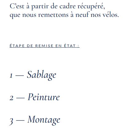 Nous sélectionnons des cadres en acier de très bonne qualité et nous les préparons à la peinture avant de le rééquiper. Notre atelier est entièrement équipé pour remettre à neuf des pièces de vélos, nous installons donc aussi des pièces de bonne qualité, en état parfait.